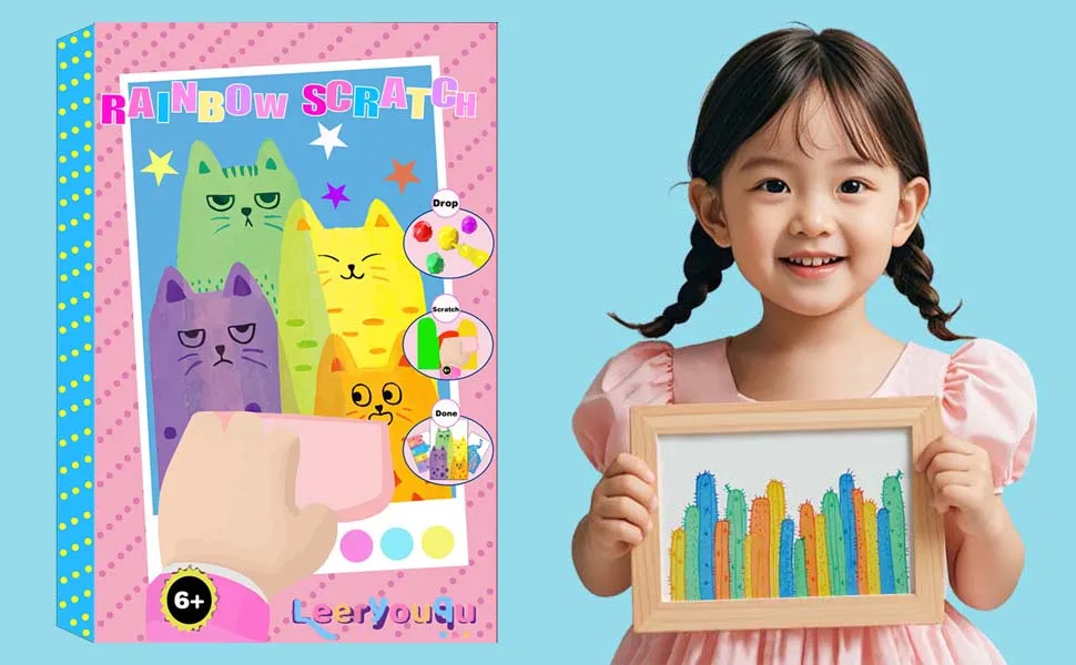 Magical Rainbow Scratch Painting – the mess-free, magical art activity that reveals brilliant colors beneath every stroke. Just scratch away the black coating with the included stylus to uncover a burst of rainbow magic underneath!
